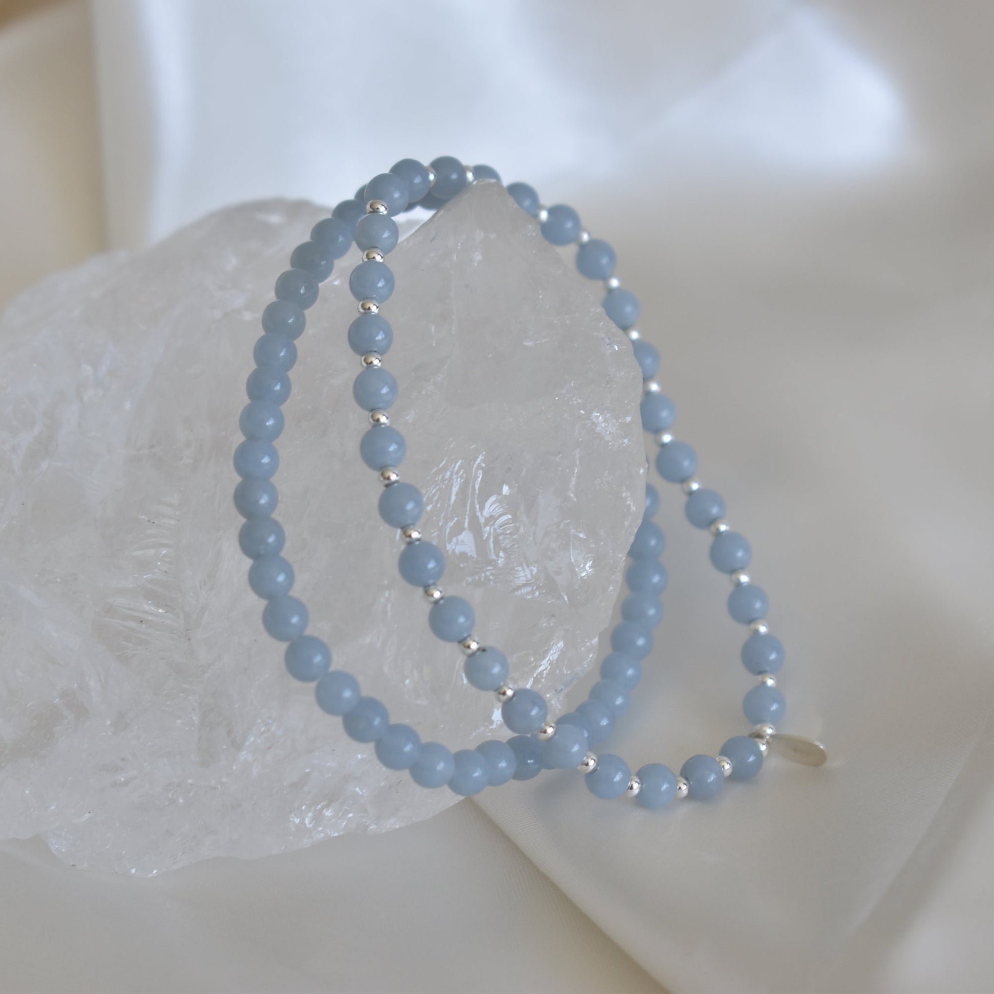 This soft blue Angelite bracelet promotes peace and serenity, helping you connect with your higher self and express your truth with ease.