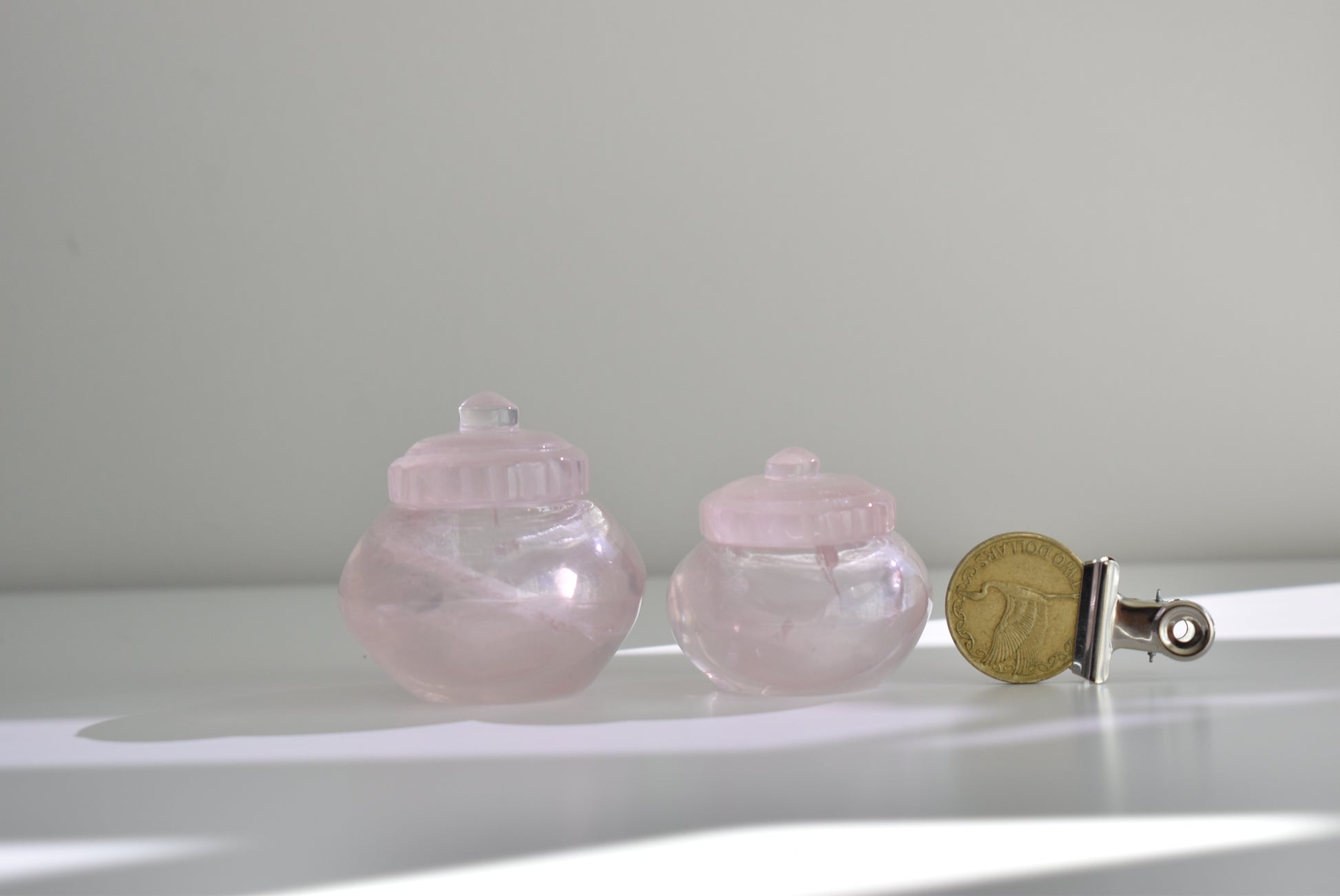 Couldn’t take my eyes off this pair the moment I saw them.Hand carved from high quality Rose Quartz, shaped into a small jar with a matching lid made slowly by hand.